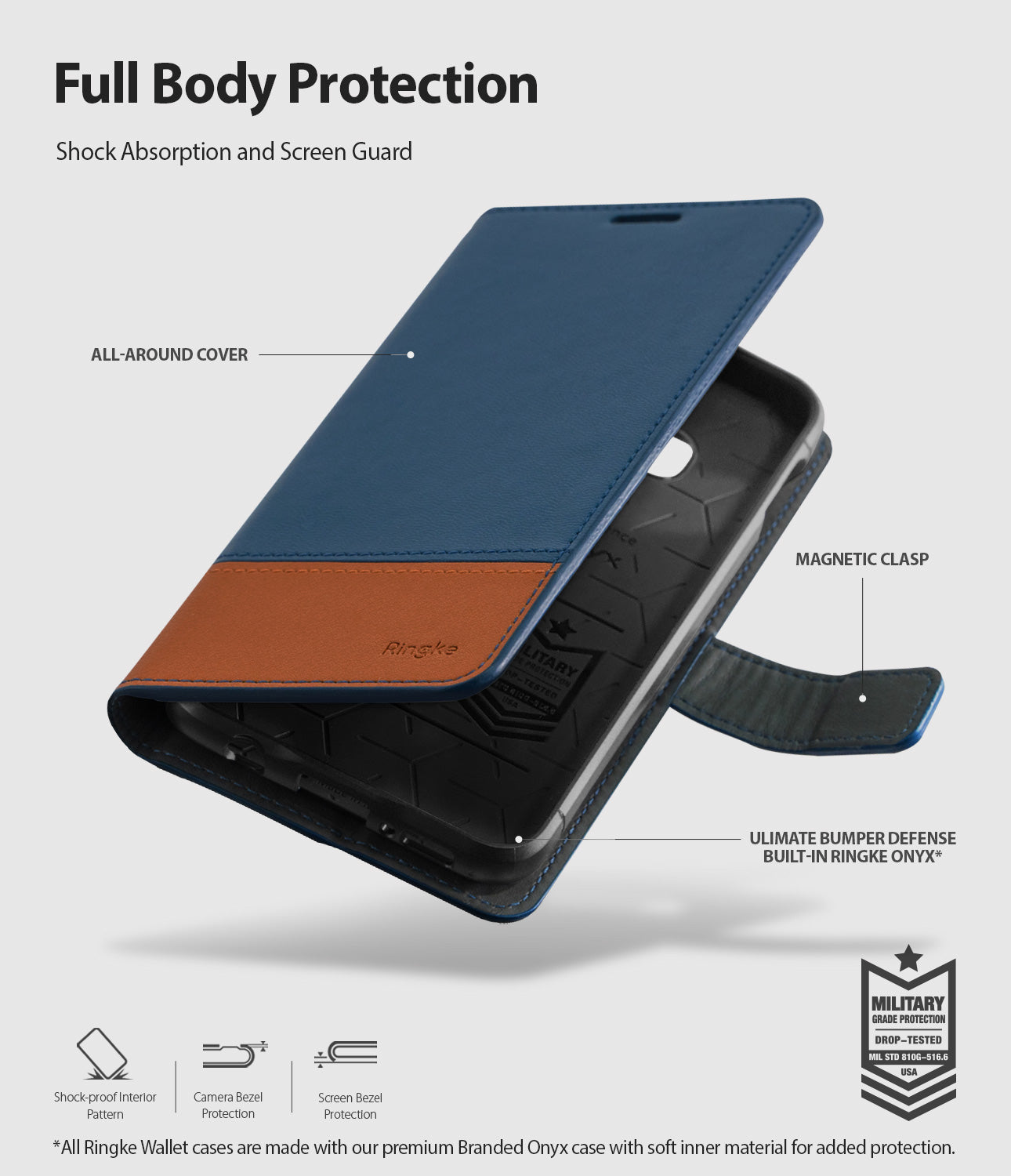 - Heavy duty, all-around protection for your device from top to bottom. The built-in, popular Ringke Onyx TPU case provides rugged defense for your phone while the durable faux Leather shell fends off scratches and debris from the screen.