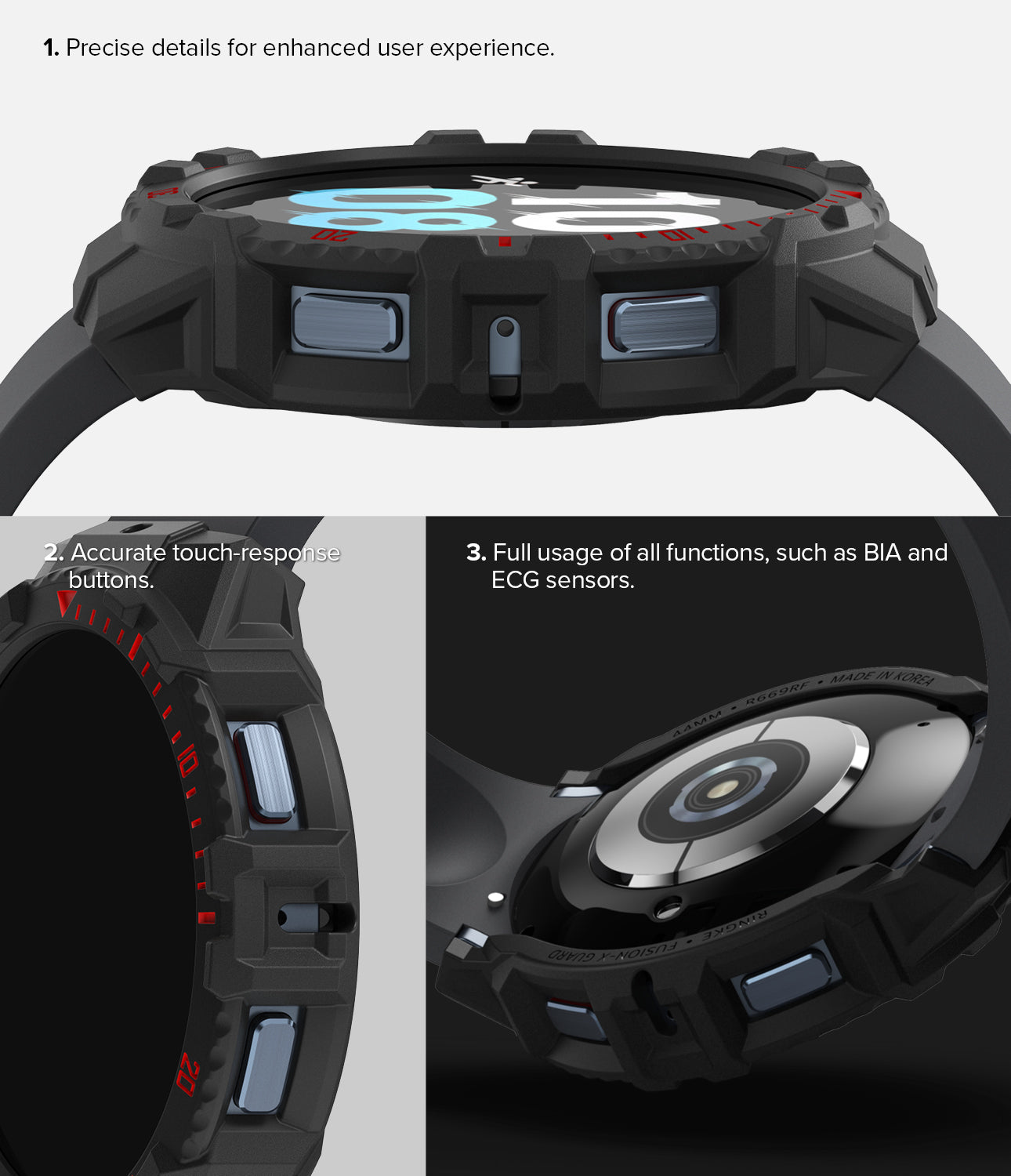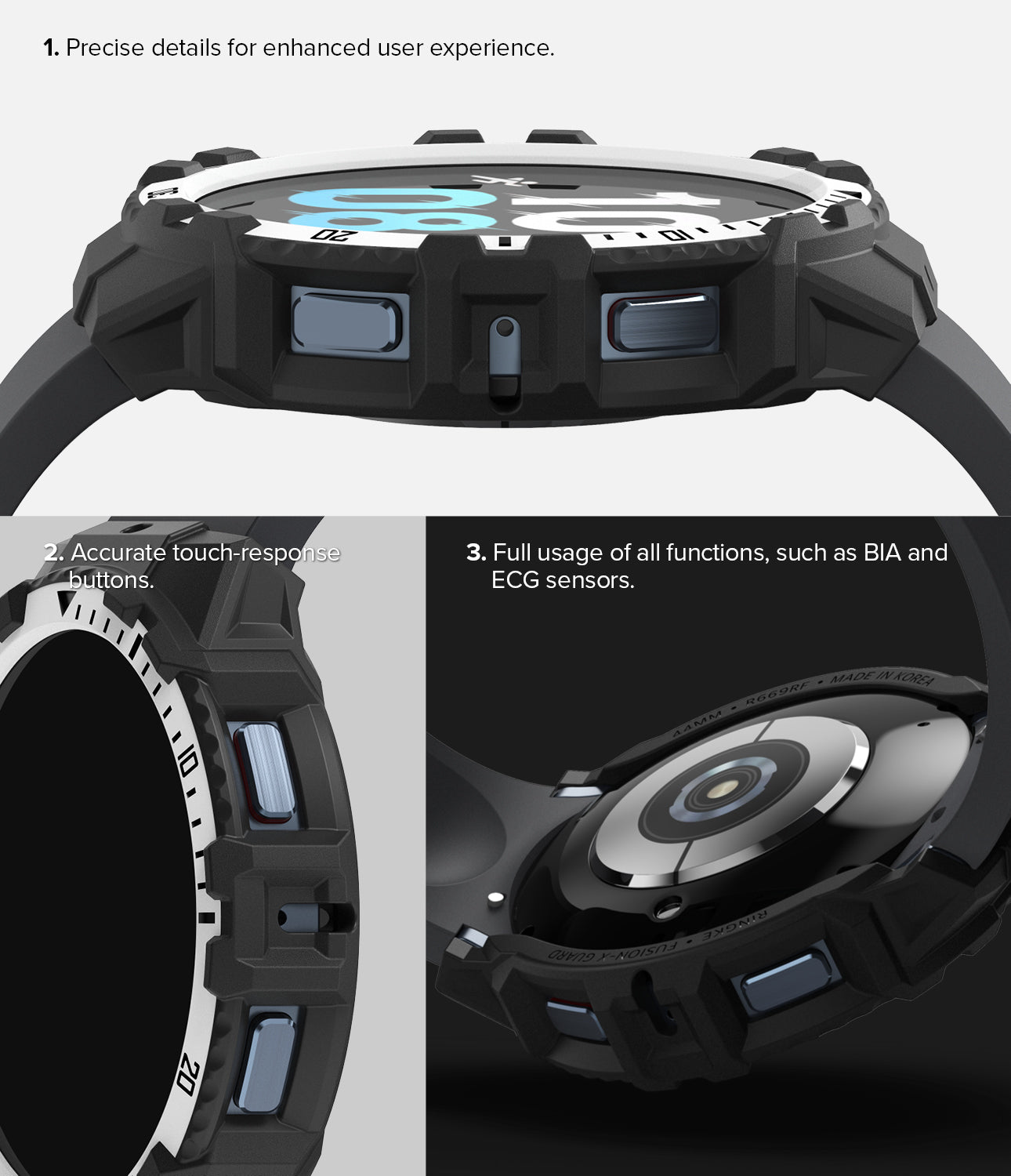 - Precisely detailed cutouts for complete usage of all smartwatch functions and Digital Touch Bezel.