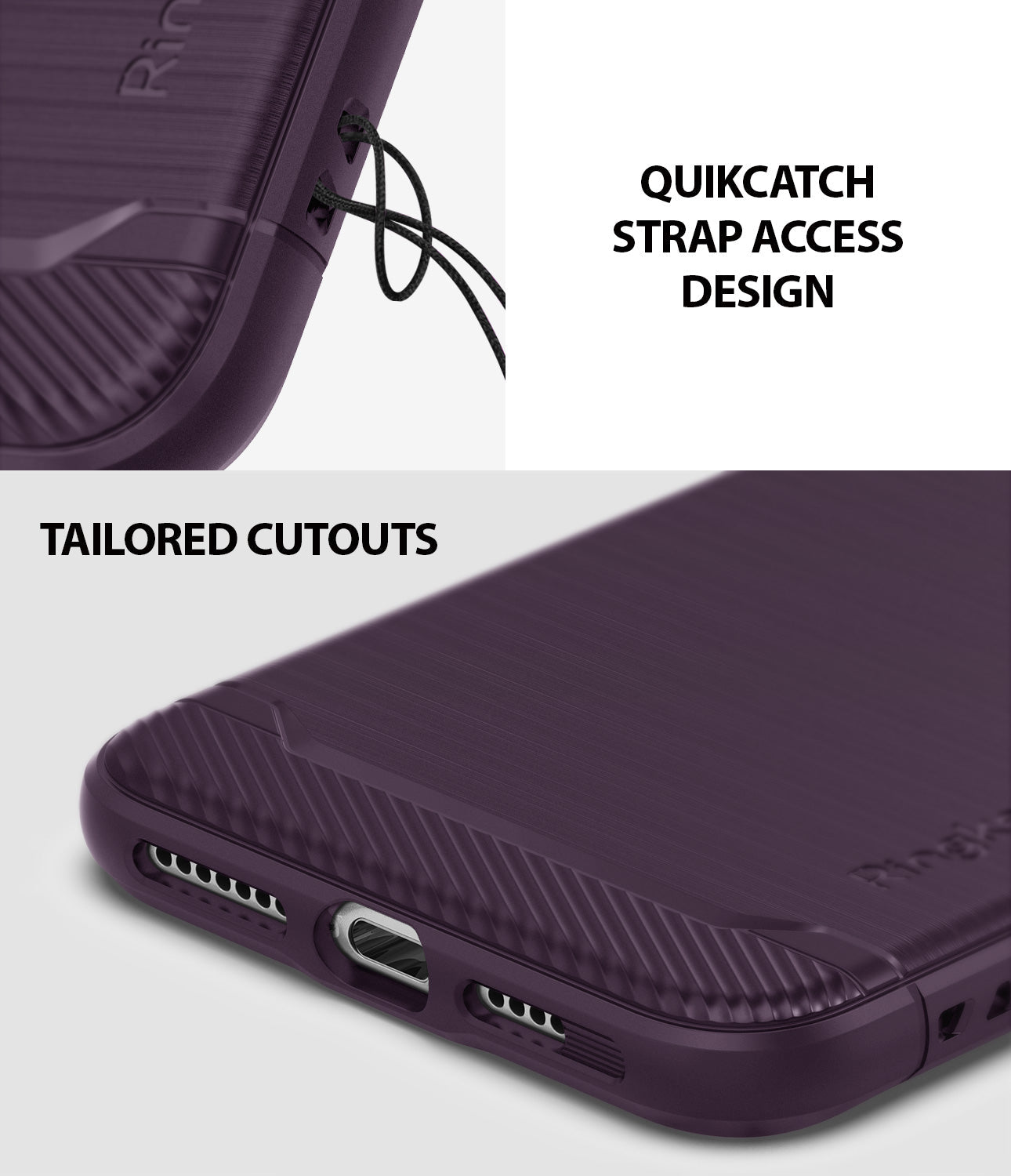 - Precision-cut dark purple TPU profile improves the slim and streamlined appearance with a tough outer flexible protective layer closely contouring each edge and curve of your device. Specialized built-in QuikCatch lanyard hole design allows to attach accessories like wrist straps to secure your phone against accidental drops