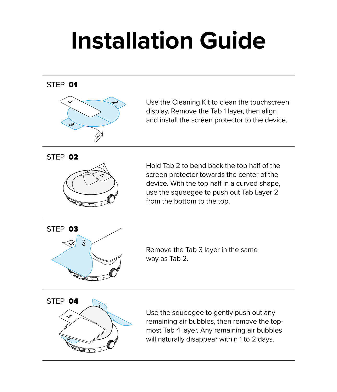 - 4-layer design with a transitory adhesive layer that removes dust and provides perfect alignment